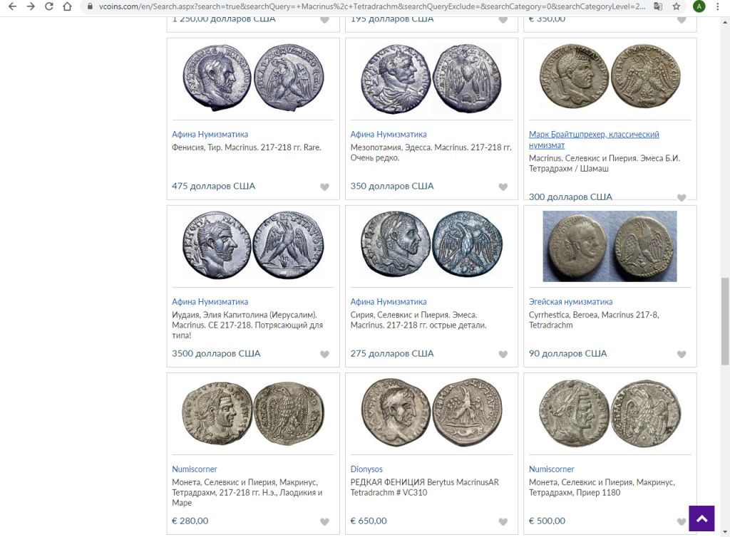 Если семейство Северов , переодически появляется в качестве , то с Макринами совсем плохо , ни одной монеты за год . Учитывая все аукционы и магазины вместе взятые . И это при том что Макрины не интересуют Алексея , а это не конкурент , а " конкуретище " С ним тяжело тягаться