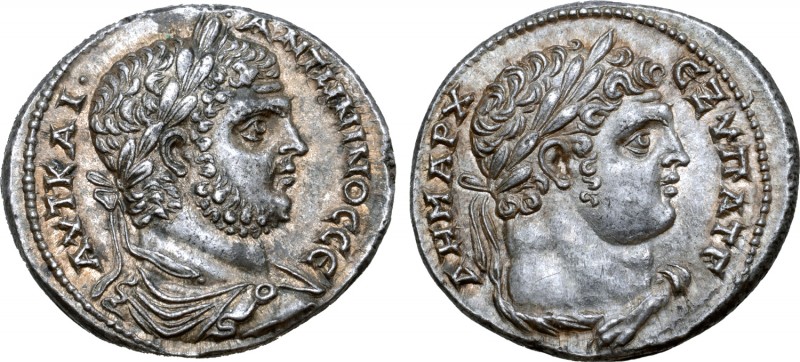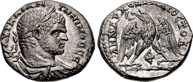 Сaracalla AR Tetradrachm of Tyre, Phoenicia. AD 209-212. AVT KAI ANTѠNINOC CЄ, laureate, draped, and cuirassed bust right / ΔHMAPX ЄΞ VΠAT Γ, laureate bust of Melkart-Hercules right, with lion's skin tied around neck. Prieur 1530 (this coin); Bellinger 299. 14.54g, 27mm, 6h.