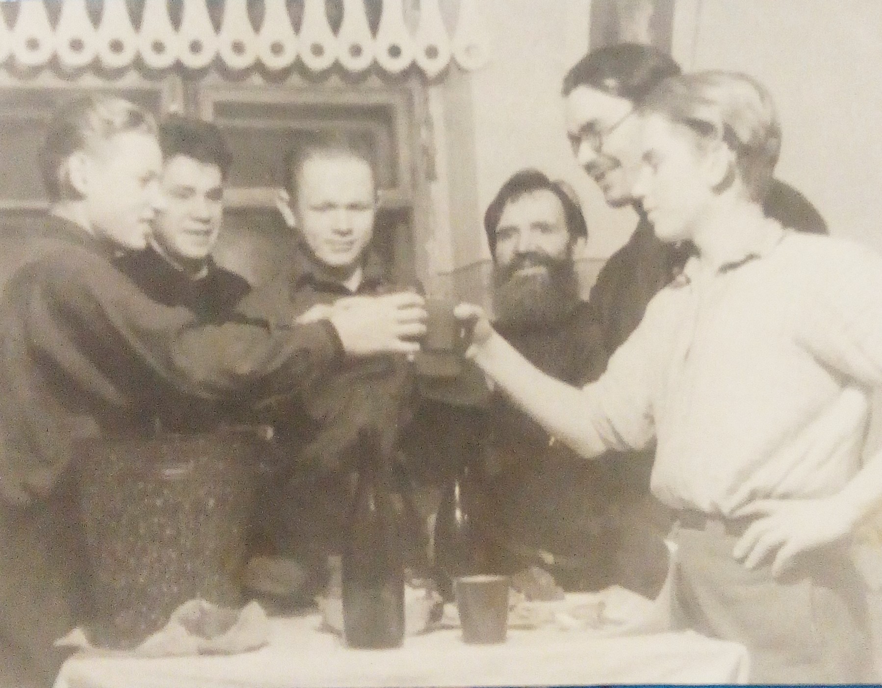 А это фото примерно того же времени. Отец рассказывал, что их, студентов, на какой-то нижегородской ярМанке уломал на посиделки какой-то сказочник (он с бородой)). В ведре серьезная брага. Продолжение следовало. Все вспоминали его добрым словом. По утру.