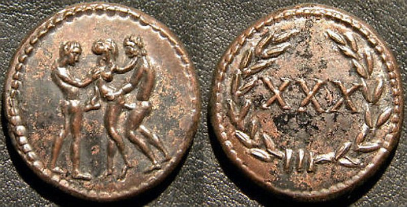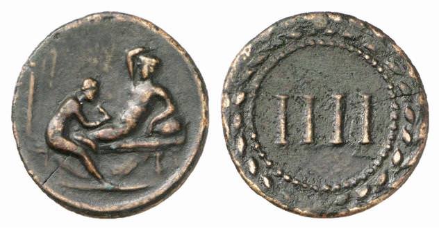 Если на лицевой стороне монеты изображены любовные позы или дама, делающая минет, то на оборотной - римские цифры. Они означали: сколько услуг может оказать проститутка.