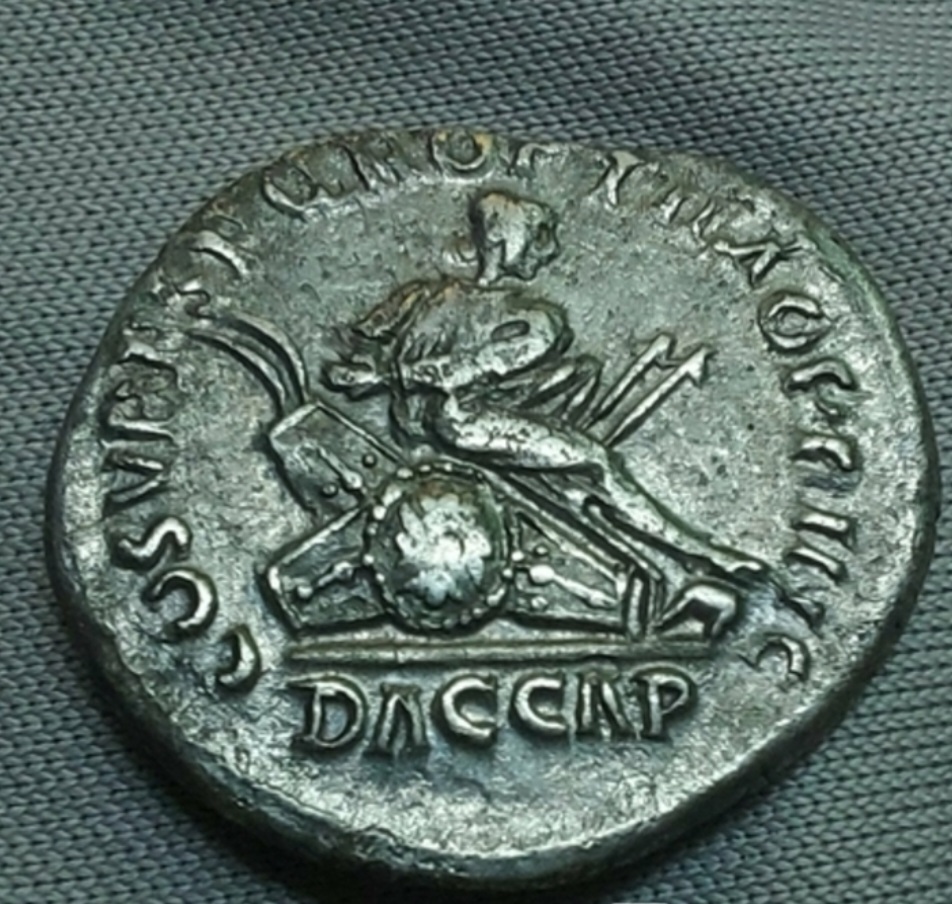 P, Dacian shown wearing a peaked cap, and seated on his shield in