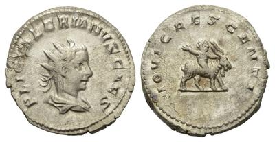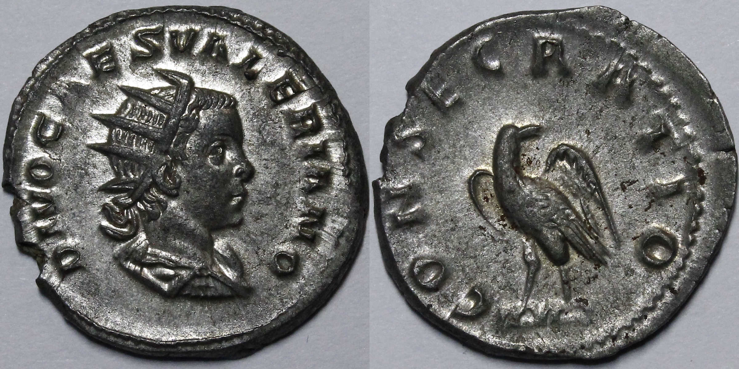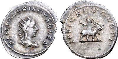 На некоторых антонинианах Валериана II двух типах - IOVI CRESCENTI и PIETAS AVGG есть портреты с тремя лентами.