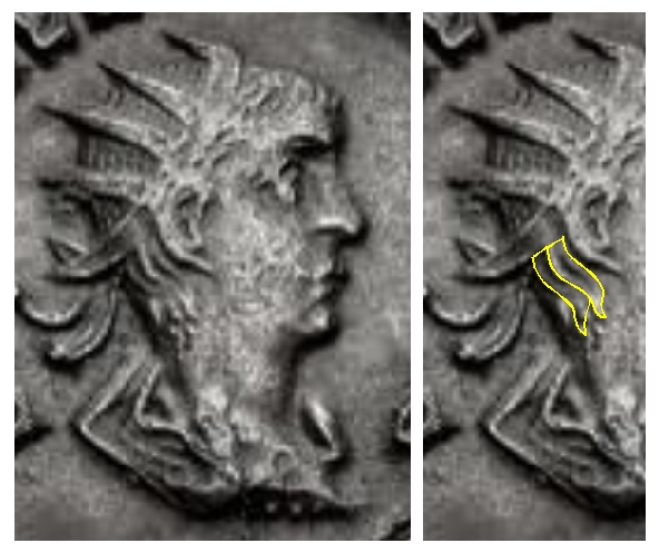 но резчик продолжал работу и делал еще один элемент , длинный - до плеча, по форме напоминающий ленточку, который перекрывает корону и начинается за ухом или над ухом, а на одном антониниане начинается от виска, как они себе представляли такую прическу ?