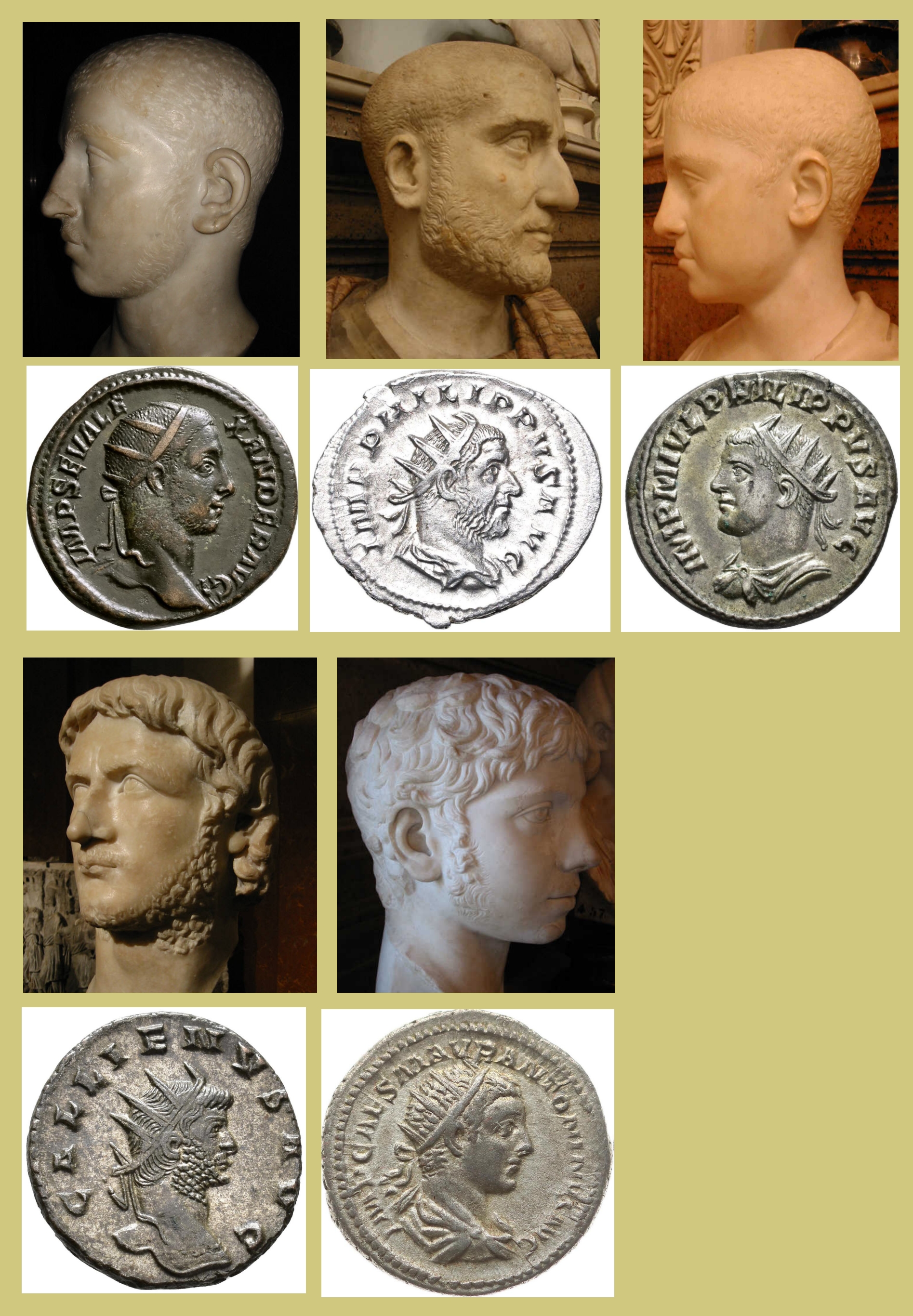 и только на двух монетных дворах : Рим и Виминаций, остальные дворы чеканили стандартные портреты с короткой стрижкой.