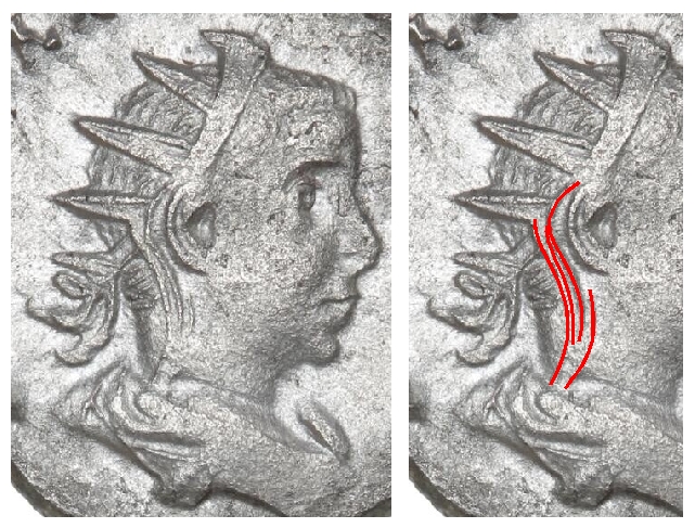 Начиная с Александра Севера в портретах придерживались определенной схемы изображения короткой прически (мелкие штрихи) до Валериана II и после.