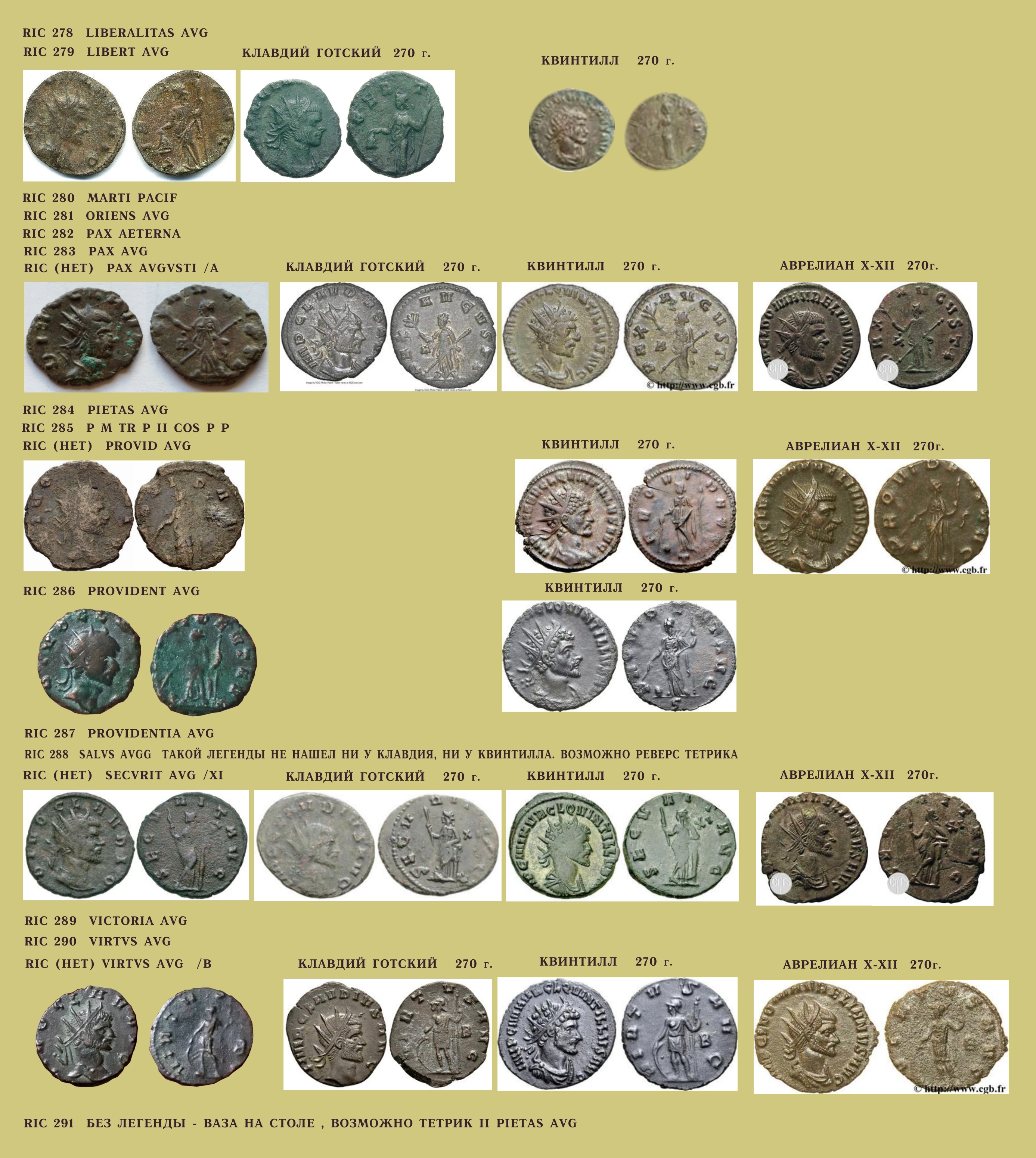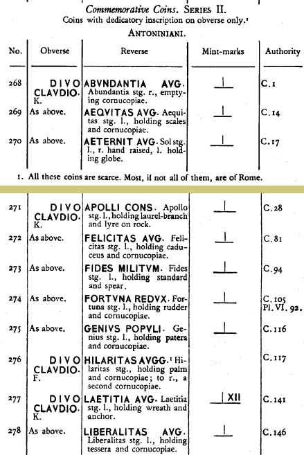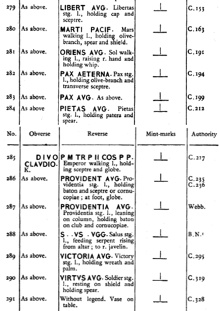 Приведу примеры версий, которые нашел в сети, но сначала надо исключить из этой серии одну монету Антиохийского монетного двора с легендой CONSECR AVG , в RIC она включена в список консекрационных монет Клавдия -1 серии (RIC -258)