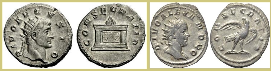 исключением была серия монет Траяна Деция посвященных обожествленным императорам от Августа до Александра Севера, Александр Север не был обожествлен, последним был в династии, кто же его обожествлять будет, но в серию вошел .