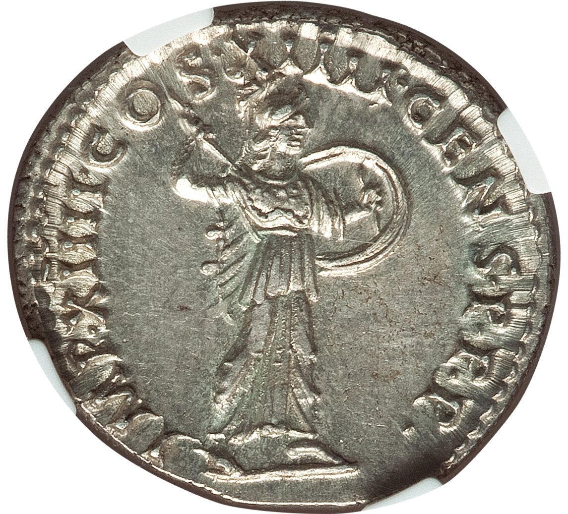 На одном маленьком аукционе из Германии выиграл за 170 евро. В итоге обошлась в 225 евро - с процентом аукциона, доставкой и так далее... Каракалла изумительный - с таким же реверсом - уже был, а вот для "папы" - никак найти в сохране не удавалось найти монетку... Теперь две "простые" вариации с таким реверсом - есть, ищем более редкие денарии, посвященные "индульгенции для Карфагена"...
