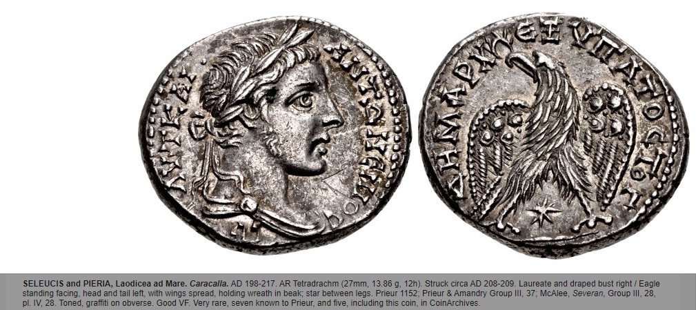 Это 217 год. Одна из самых распространенных тетрадрахм Лаодикеи Приморской или Лаодикеи-ад-Маре... Тут особенно - некрасивый портрет Каракаллы... Я бы оценил стоимость монеты в районе 50 долларов... Ну, максимум - до 100 долларов (хотя, это вряд ли)...