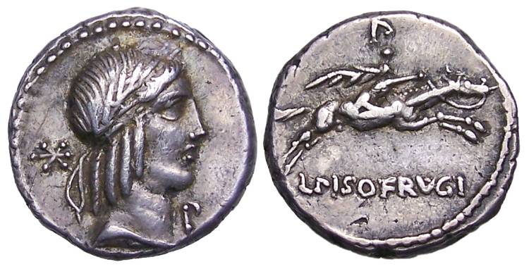 А у меня вот такой Пизон Фруги!Очень распространённая монетка!Но и всяческих дифирентов на ней полно!Около восьмидесяти,если верить Георгиевичу!Но самое интересное,что сын этого монетария в 67 году до н э выпустил подобный денарик.тоже с Аполоном и всадником на другой стороне,но у него разновидностей более 430!