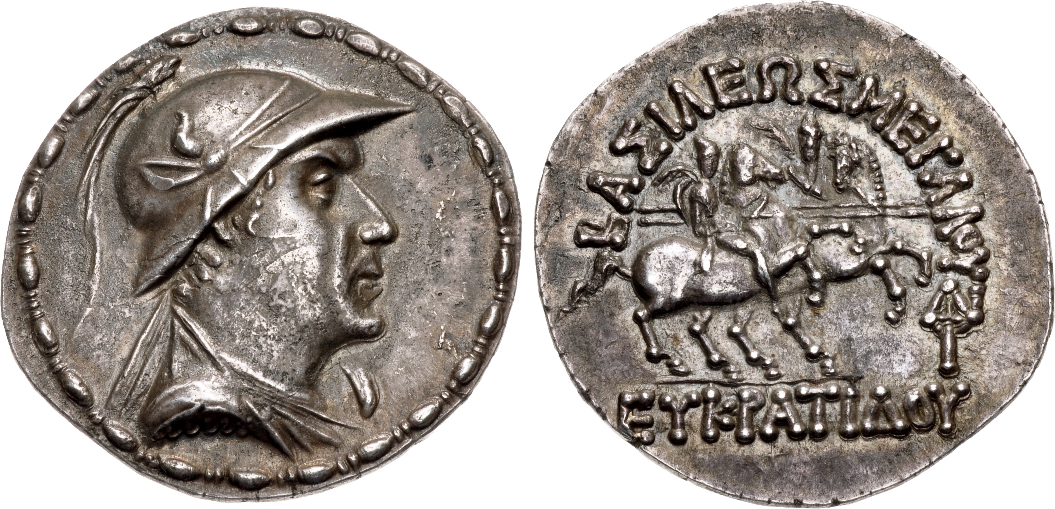 BAKTRIA, Greco-Baktrian Kingdom. Eukratides I Megas. Circa 170-145 BC. AR Tetradrachm (35mm, 16.11 g, 12h). Diademed, draped, and cuirassed bust right, wearing crested helmet adorned with bull's horn and ear / The Dioskouroi on horses rearing right, holding palms and spears; monogram to inner right. Bopearachchi 6E; HGC 12, 131. Some find patina, small laminations under patina, minor porosity. EF.