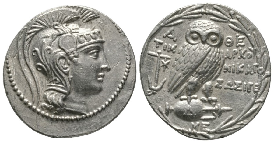 Это афинский выпуск для своей клерухии на Делосе 140-90 гг. д.н.э. Островные монеты вообще очень интересная тема, в принципе. По поводу исторических тонкостей с клерухиями, что там и как было, я не до конца разобрался. Если кто-то, кто в теме прокомментирует, буду рад. Монетка совсем маленькая, поэтому на реверсе изображение не сразу считывается. Это - племохойя - небольшой сосудец для благовоний, который якобы служил для свадебных обрядов. По сторонам от него буквы А , Θ и Е. На аверсе все очень хорошо видно - голова Артемиды с колчаном за головой.