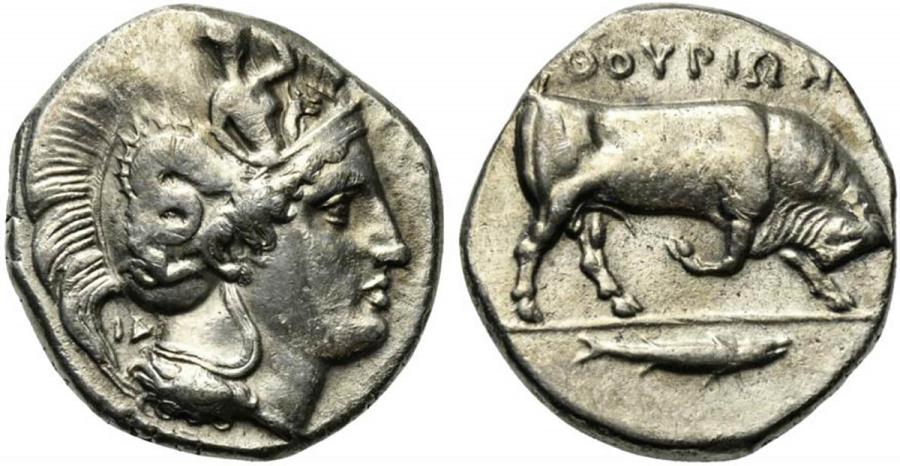 Southern Lucania, Thourioi, c. 400-350 BC. AR Distater (25mm, 15.73g, 12h). Head of Athena r., wearing crested Corinthian helmet decorated on its bowl with Skylla scanning; IΔ behind neck guard. R/ Bull butting r.; in exergue, fish r. Noe F30; HNItaly 1803; BMC 29.