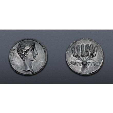 Augustus. 27 BC-AD 14. AR Cistophorus (25mm, 11.61 g, 12h). Pergamum mint. Struck 27-26 BC. IMP • CAESAR, bare head right / AVGV STVS, six stalks of grain tied in a bundle. RIC; Sutherland Group IVγ (unlisted dies); RPC I 2212; RSC 32a; BMCRE = BMCRR East 289; BN 955 bis. Dark blue-gray tone, some scratches and smoothing under tone. Good VF.