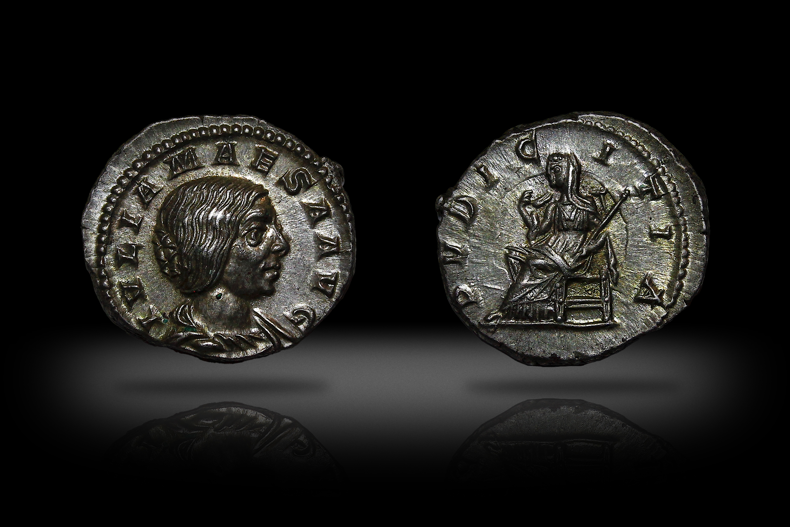 Реверс: NOBILITAS (лат. — «Благородство, великодушее») - Нобилитас держит в руках скипетр и Палладиум.