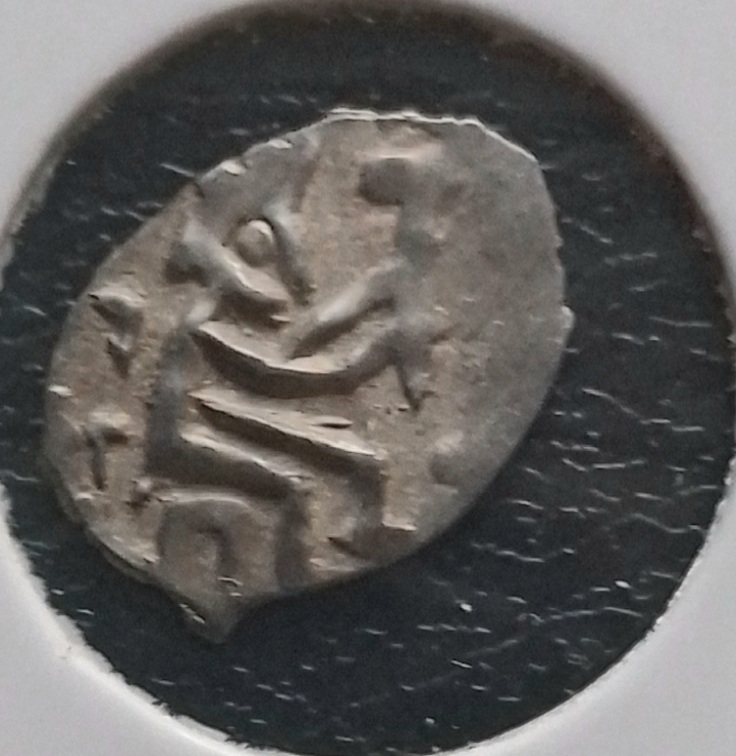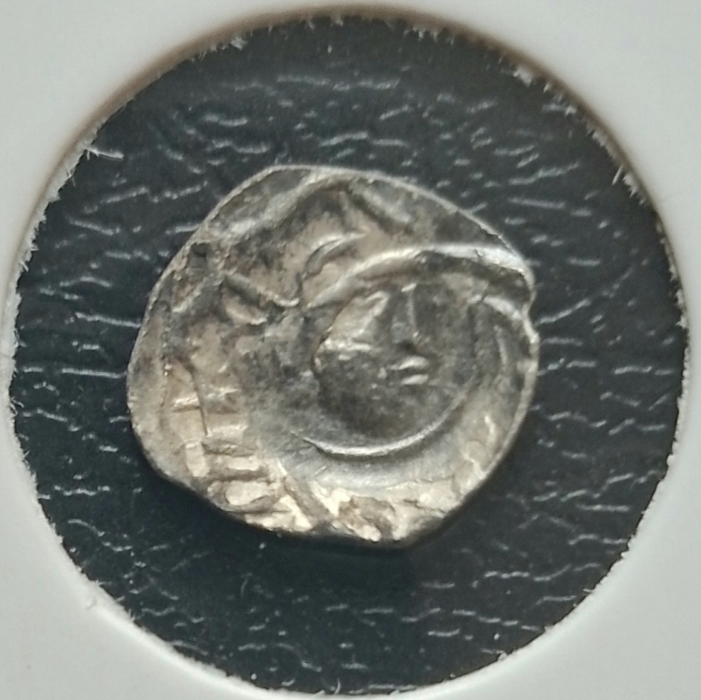 Надчеканка в нижнеокских-волжских землях головы на обрезанных дирхемах и русских деньгах. Всегда прототипы довольно ранние. Этот штемпель известен в семи экз. Пока лучший из опубликованных.