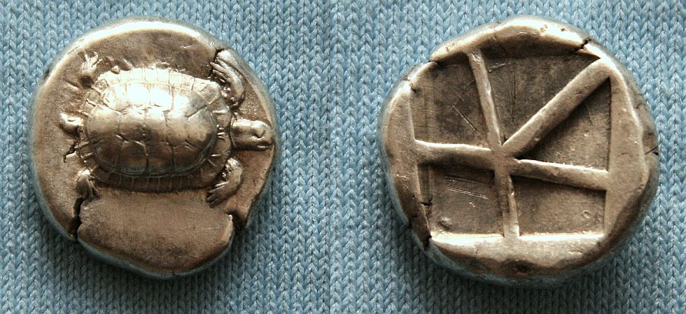 Кстати, эта морская черепашка из коллекции москвича, моего давнего знакомого-античника (с 80-х), у которого в коллекции есть сиракузская декадрахма (я видел и держал). Он отдавал часть коллекции (в т.ч. и эту черепашку), чтобы взять декадрахму Александра Великого. Взял. Я его поздравляю! Он на форуме зарегистрирован, иногда читает. Мне сказал, что теперь опять ему надо Эгину восстанавливать.