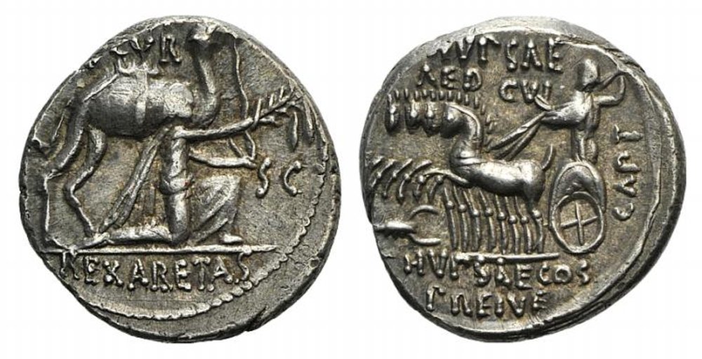 Монета чеканена Квинтом Цецилием Метеллом Пием, основателем испанского города Медельин, родины Кортеса, первоначально назывался в честь основателя Метеллин. Герб принадлежит городу тезке - колумбийскому Медельину где жил знаменитый наркоторговец Пабло Эскобар - знаменитый наркоторговец, торговавший в том числе кокаином. Кока, из которого добывается кокаин - первоначальный ингредиент прохладительного напитка кока кола.