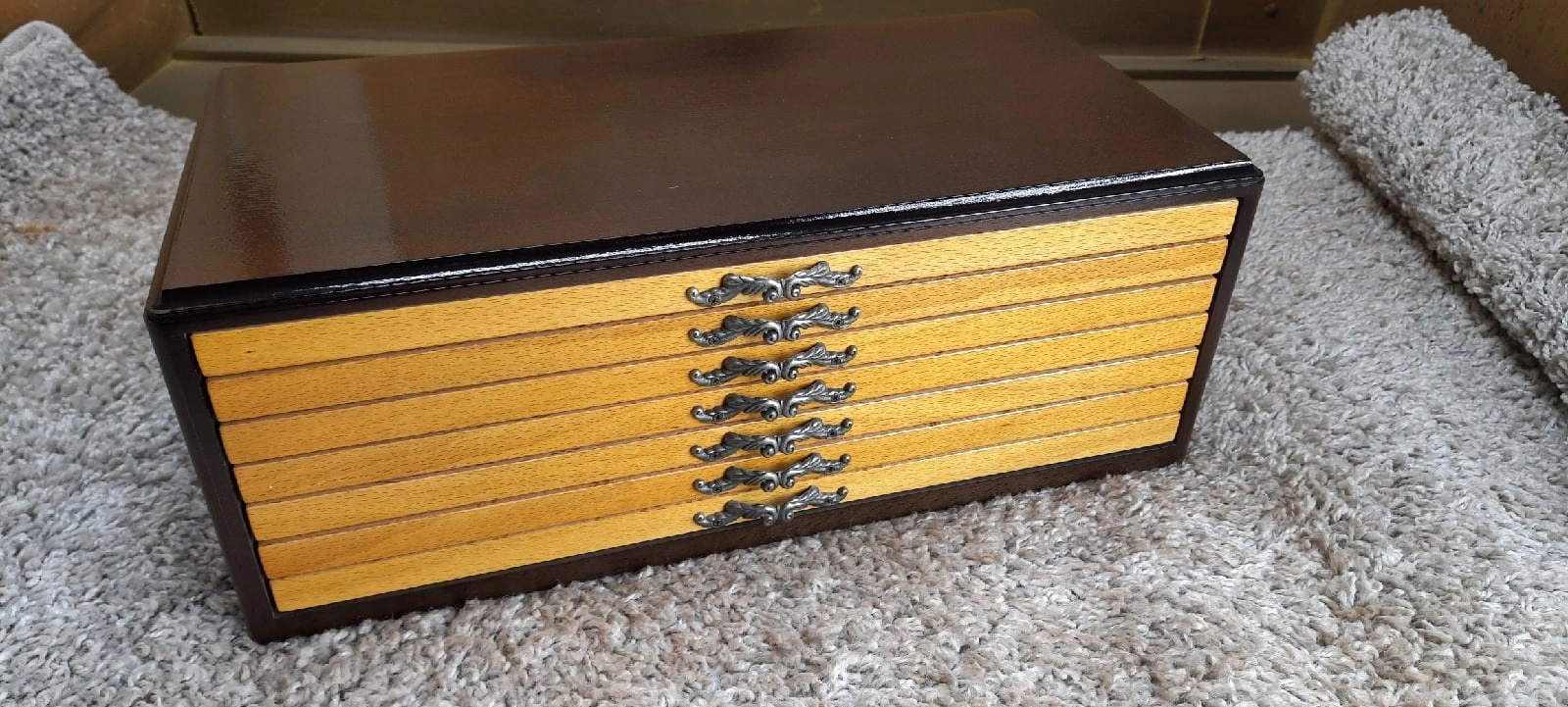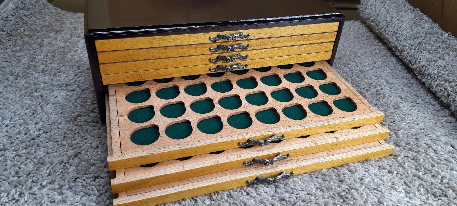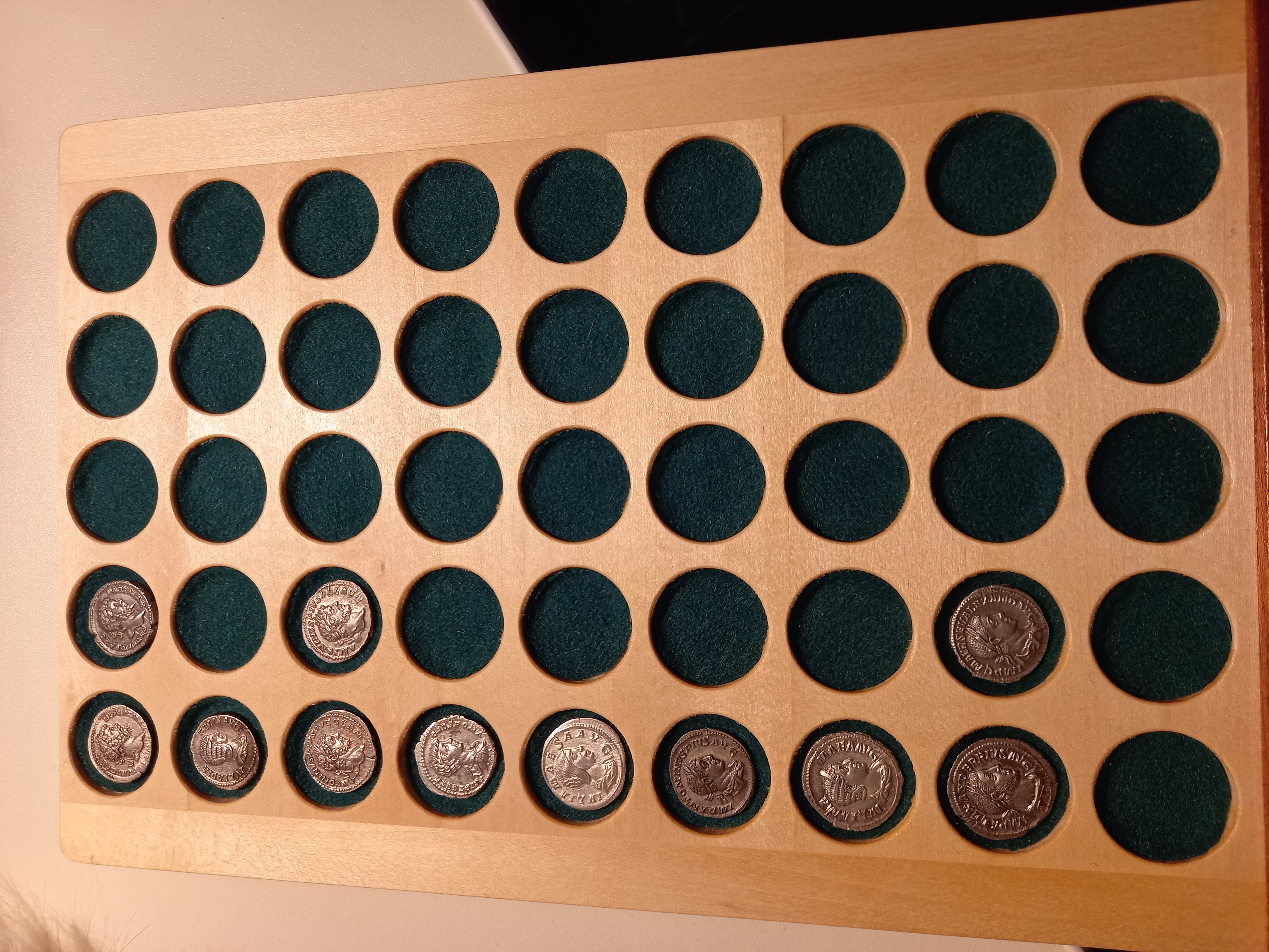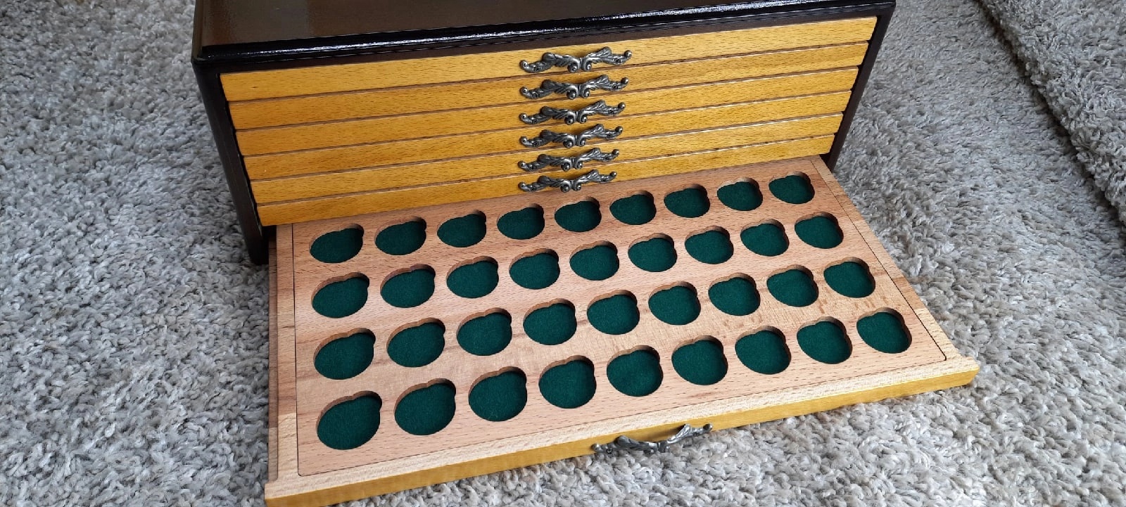 Мюнцкабинет наконец то дома. Монетки справили новоселье. В живую даже лучше , чем на фото. Если кому то надо, то дам контакты ( не реклама). Человек из Мценска. Делает мюнцы и разные шкатулки давно. Опыт есть. Мне , учитывая хорошую репутацию и отзывы на сайтах, отправил с постоплатой. Оплатил только когда получил. Упакован при отправке очень надёжно, в специально сделанный под мой мюнцкабинет ящик. В общем я полностью доволен.